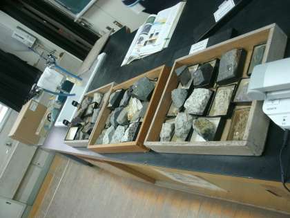 6年2組は、理科室で岩石標本の観察をしていました。