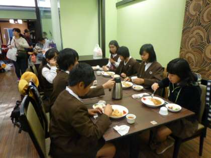 10月28日(火)今朝は気温が低く、寒い朝となりました。今日は1年生から3年生までの学習参観、学級PTA集会、懇談会です。保護者の皆様のご来校をお待ちしています。修学旅行の記事を引き続きお届けいたします。2日目のお昼は、カツカレーとサラダをいただきました。