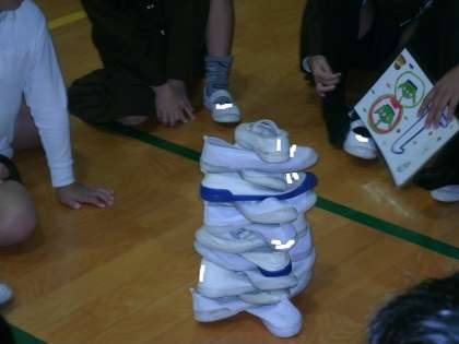 たてわり班ごとに、それぞれの上ぐつを慎重に積み上げていました。