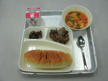 今日の給食は、牛肉の香味焼き、ケチャップ煮、うずら豆のグラッセ、おさつパン、牛乳です。