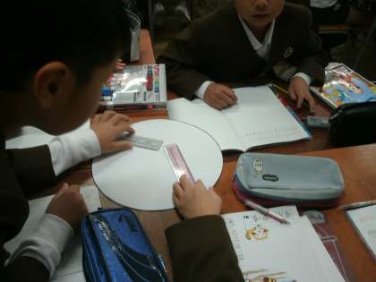 班で相談して、いろいろな方法で円の中心をさがしていました。