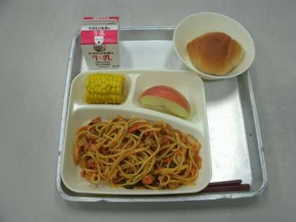 今日の給食は、きのこのスパゲッティ、焼きとうもろこし、りんご、黒糖クレセントロールパン、牛乳です。