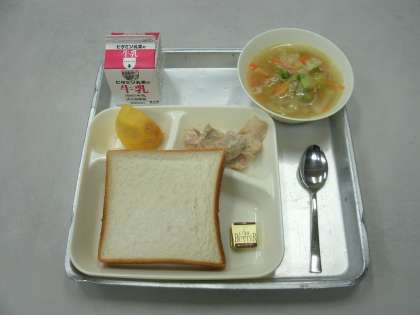 今日の給食は、鶏肉のガーリックマヨネーズ焼き、スープ、かき(富有柿)、食パン、バター、牛乳です。