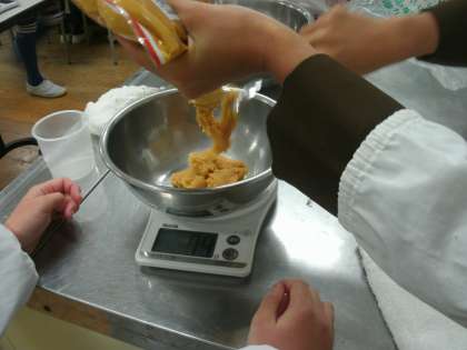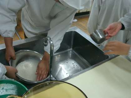 米を洗ったり、みその計量をしているところです。