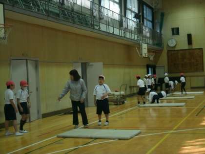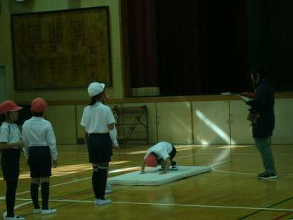 3年生は、体育館でマット運動をしていました。