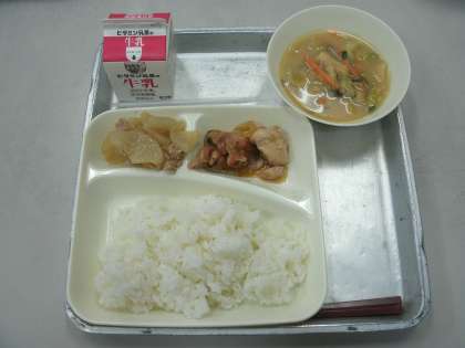 今日の給食は、鶏肉の甘辛焼き、みそ汁、だいこんの煮もの、ごはん、牛乳です。
