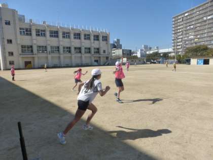 10月30日(木)秋晴れのさわやかな天気になりました。4年生は、体育の時間に運動場でティーベースボールをしていました。