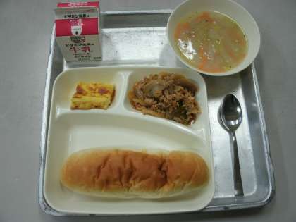 今日の給食は、豚肉のケチャップソテー、コーンスープ、焼きプリン、おさつパン、牛乳です。