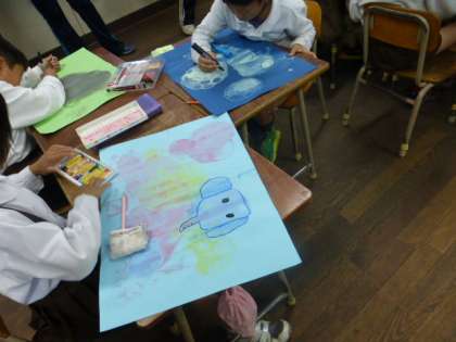 2年生は、図画工作科の研究授業を行いました。石けん水と絵の具で作ったあわでできた模様の形や色から想像を広げながら絵で表す「キラキラシャボンで」という学習をしました。