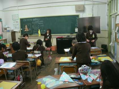 染め出しした和紙を三角形に切って、クリスマスツリーを作っていました。