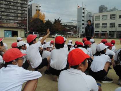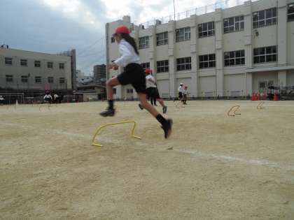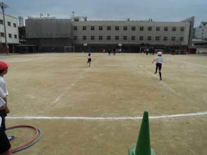 4年は合同体育でした。ミニハードルを練習しました。学年が上がると、もっと高いハードルを使います。それまでに走り方、ハードルを越えるときのリズムをつかむ練習をしています。