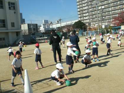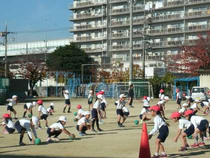 1年生は、運動場で体育の学習をしていました。