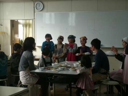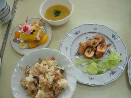 メニューは、鶏むね肉の野菜ロール巻き、コーンスープ、きのこピラフ風、かぼちゃケーキです。美味しそうにできあがりました。