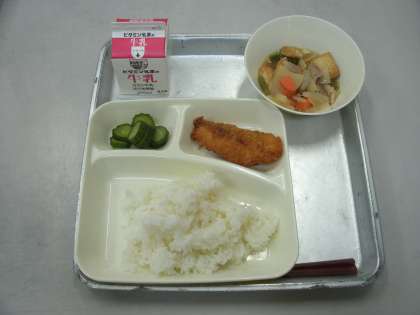 今日の給食は、たらのフライ、豚肉と厚揚げの煮もの、あっさりきゅうり、ごはん、牛乳です。