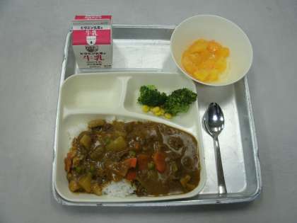 今日の給食委は、冬野菜のカレーライス、ブロッコリーとコーンのサラダ、黄桃(カット缶)、牛乳です。