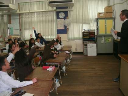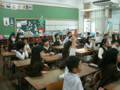 先生が読み上げる説明を聞いて、どんなことばについての説明なのか考えて答えていました。