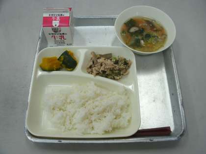 今日の給食は、豚肉と干しずいきのみそ煮、すまし汁、焼きかぼちゃ、ごはん、牛乳です。