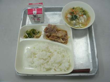 今日の給食は、焼き肉、五目汁、きゅうりともやしのおひたし、ごはん、牛乳です。