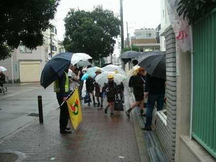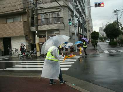 毎週水曜日は尼崎信用金庫の皆さんも交差点に立って児童の登校を見守ってくださいます。雨の中、ありがとうございます。