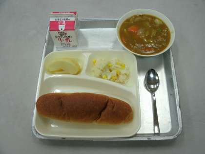 今日の給食は、豚肉と野菜のカレー煮、カリフラワーとコーンのサラダ、りんご、ライ麦パン、牛乳です。