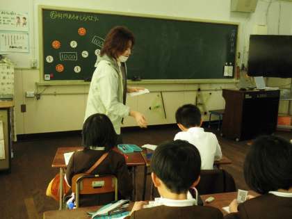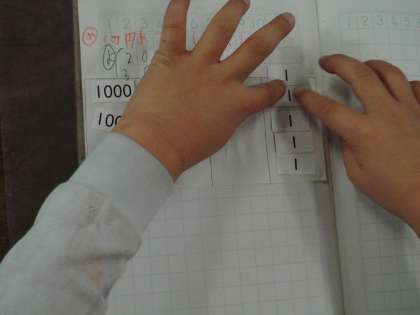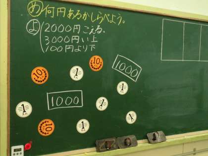 算数で1000より大きい数を表す学習をしています。いくつかのお金を黒板に貼って、何円あるか確かめるにはどんな方法があるのか考えました。そこから位で考えていけばよいことがわかりました。