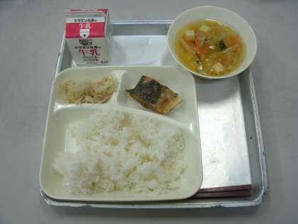 今日の給食は、さばのみそ煮、すまし汁、もやしのゆずの香あえ、ごはん、牛乳です。