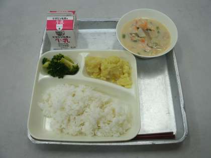 今日の給食は、かす汁、ブロッコリーのしょうがづけ、栗きんとん、ごはん、牛乳です。