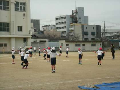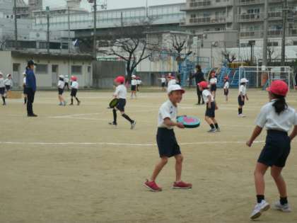 なわとび運動とかけあしをした後、ドッジビーの練習をしていました。