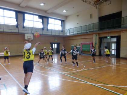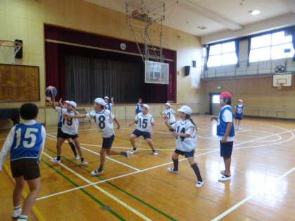 5年生は、体育の時間に体育館でバスケットボールをしていました。