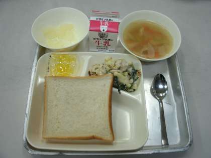 今日の給食は、マカロニグラタン、だいこんのスープ、和なし(カット缶)、食パン、マーマレード、牛乳です。