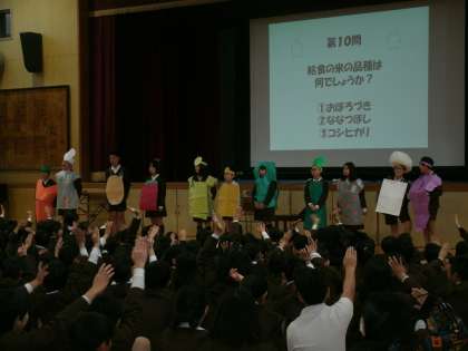 健康委員会は「食べ物なりきりくいず」、計画委員会は安全な学校生活の過ごし方を自作映画にして発表しました。どちらの委員会も力作で楽しい発表でした。