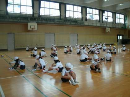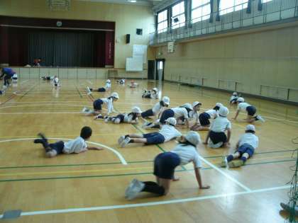 走って逃げる鬼ごっこではなく、「おしりを床につけたまま」、「腕の力を使って」など、いろいろな動きを使った鬼ごっこをしていました。