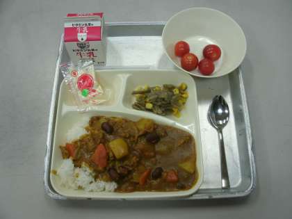 今日の給食は、豚肉と金時豆のカレーライス、ごぼうサラダ、プチトマト、牛乳です。