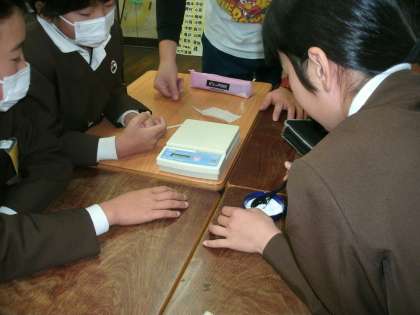 「もののとけかた」の学習で、食塩を水に溶かした時の重さの変化を確かめる実験をしていました。
