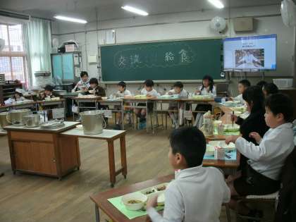 4の1と2の1の子どもたちが半分入れ替わって給食を仲良く食べていました。