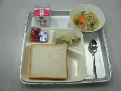 今日の給食は、あじのレモンマリネ、てぼ豆のスープ煮、固形チーズ、食パン、イチゴジャム、牛乳です。