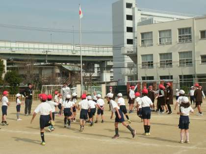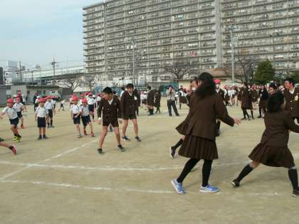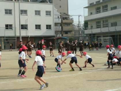 1年生と6年生が15分休みに「ドッジビー大会」をしました。