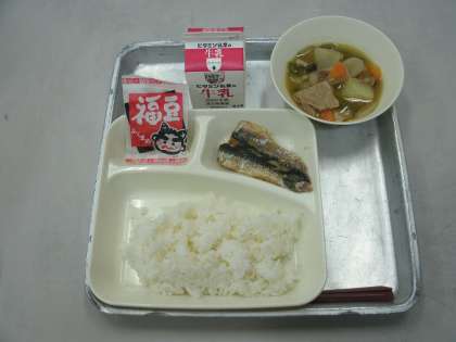 今日の給食は、いわしのしょうがじょうゆかけ、含め煮、いり大豆、ごはん、牛乳です。