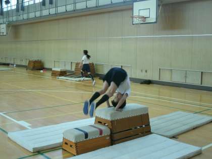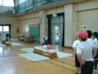 マット運動で台上前転などの練習をしていました。サーキットトレーニングの形式で練習していました。