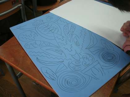 木版画に挑戦します。空想した花を描いていました。下絵をカーボン紙を使って写し取っていました。