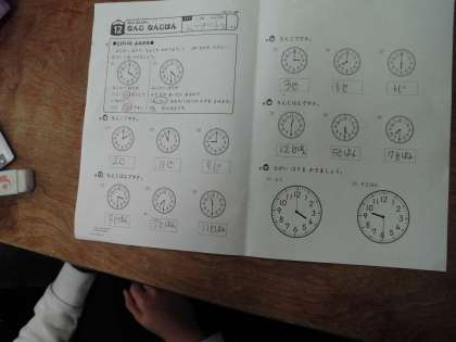 算数で時計のよみかたについて勉強しました。模型の時計で、1時間と30分について復習しました。次からは1分について学習します。