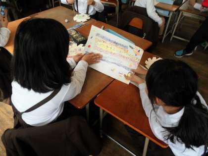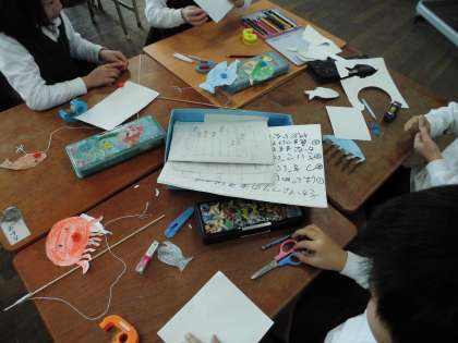 来週、いそじ保育所のこどもたちを招待して交流します。その時にいっしょに遊ぶためのおもちゃを作ったり、遊び方の説明を練習したりしました。年下のこどもたちに楽しんでもらえるように準備をがんばっています。