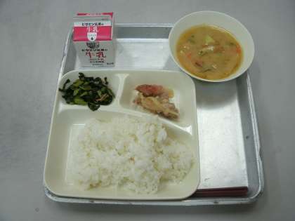 今日の給食は、鶏肉のゆず塩焼き、さつまいものみそ汁、小松菜の煮浸し、ごはん、牛乳です。