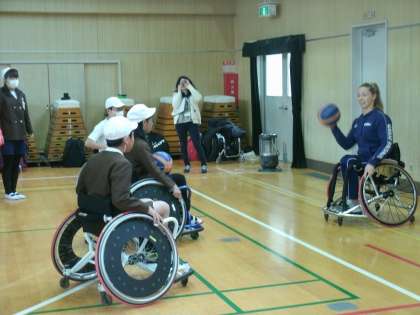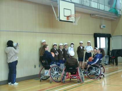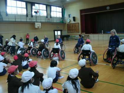 明日から、大阪市中央体育館で国際親善女子車いすバスケットボール大阪大会が行われます。本日2時間目にイギリスチームが来校し、5・6年生と交流会を行いました。
