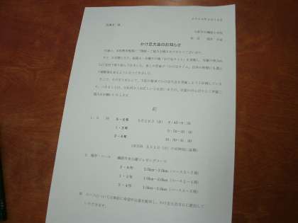 本日、お知らせのプリントを持ち帰りますのでお読みください。