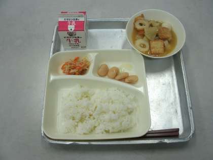 今日の給食は、関東煮、もやしとにんじんの甘酢あえ、白花豆の煮もの、ごはん、牛乳です。