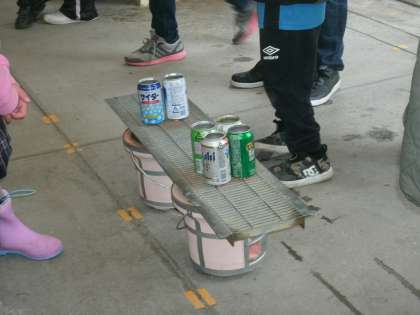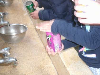 あいにくの雨となってしまいましたが、給食室前で、「アルミ缶炊飯」をしていました。