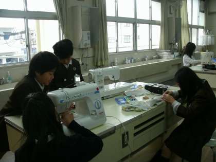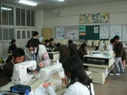 6年1組は、家庭科室でぞうきんを縫っていました。