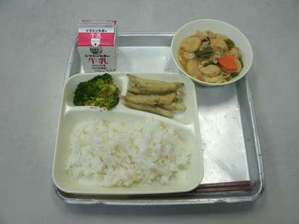 今日の給食は、きびなごてんぷら、一口がんもとじゃがいもの煮もの、ブロッコリーのごまあえ、ごはん、牛乳です。