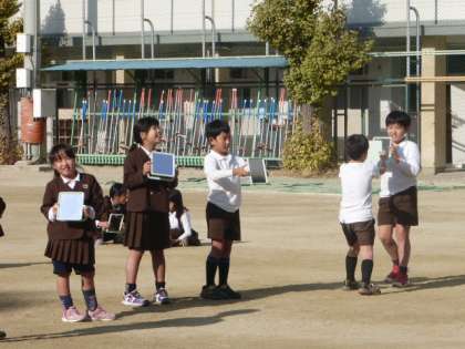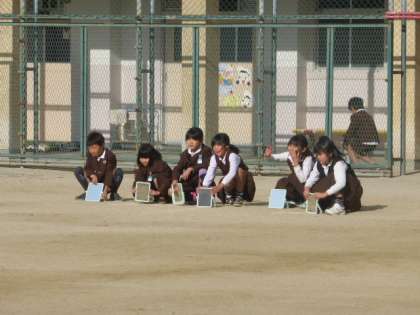 3年生は、理科の時間に、光の性質について運動場で鏡を使って実験していました。